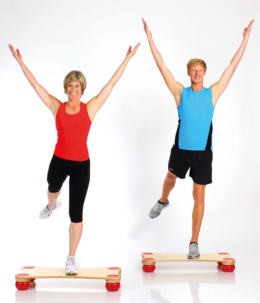 Mit vier Bällen unter dem Holzboard gibt er Aktiven in allen Fitnesslevels die Möglichkeit, in das sensomotorische Training einzusteigen und dann zu steigern.