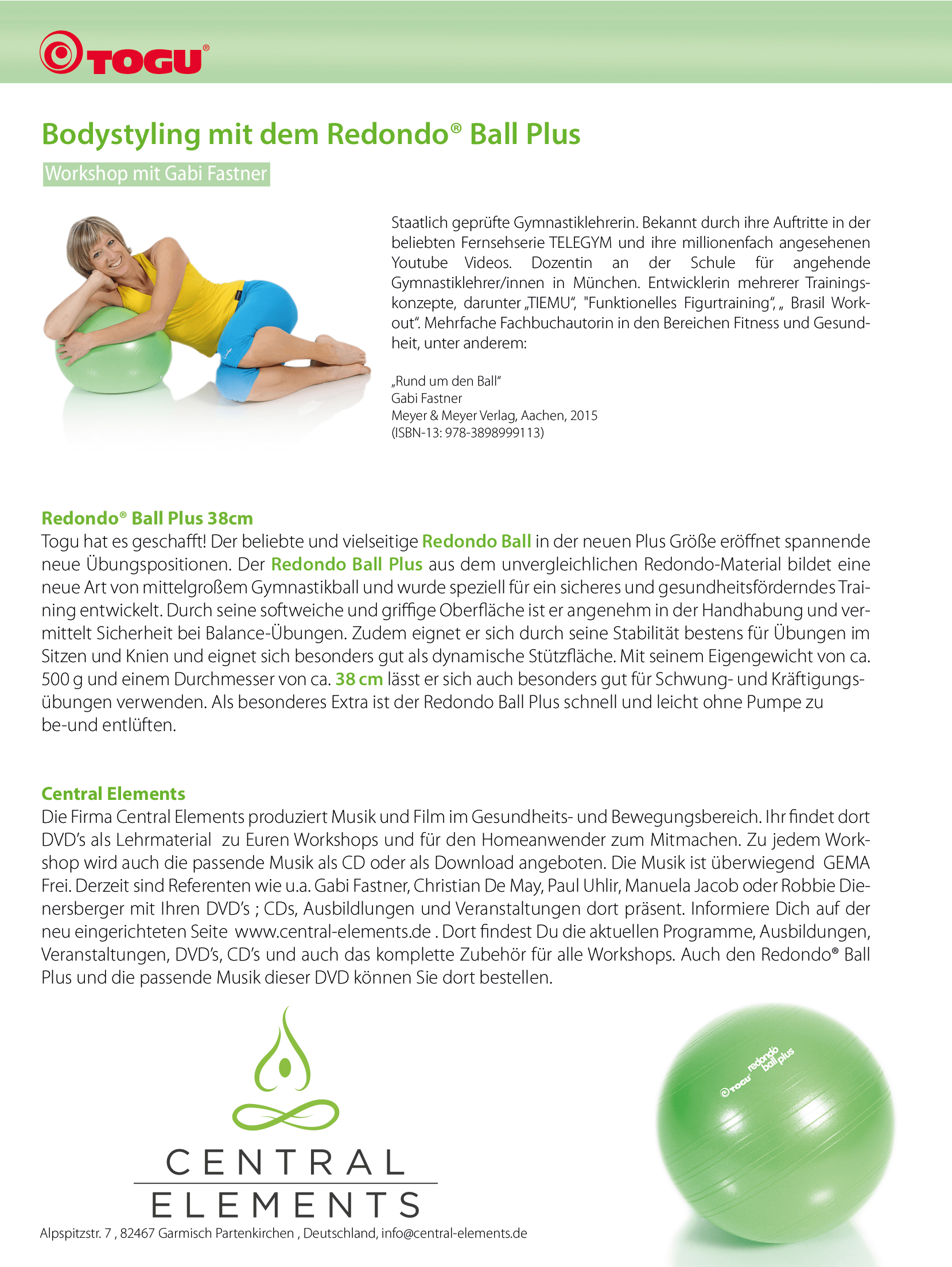 Gabi Fastner presents exercises around the new Gymnastic Ball Redondo Ball Plus. The DVD is designed for professionals as trainers and coaches as a teaching video as well as a home video for those who want to keep fit.