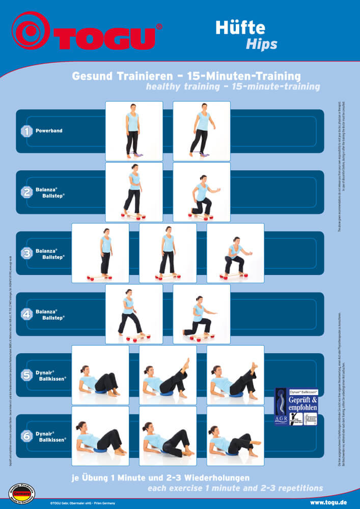The 15-minute hip program developed by the team doctor of the German national snowboarding team Dr. Sommer, which you can download here free of charge online and easily integrate into your everyday life, contains such exercises. It can also be carried out by untrained persons. By using the TOGU hip equipment set, which is adapted to it, the training stimuli are even more intensive. Further articles, which you find in this category, are also suitable for the application in this area.