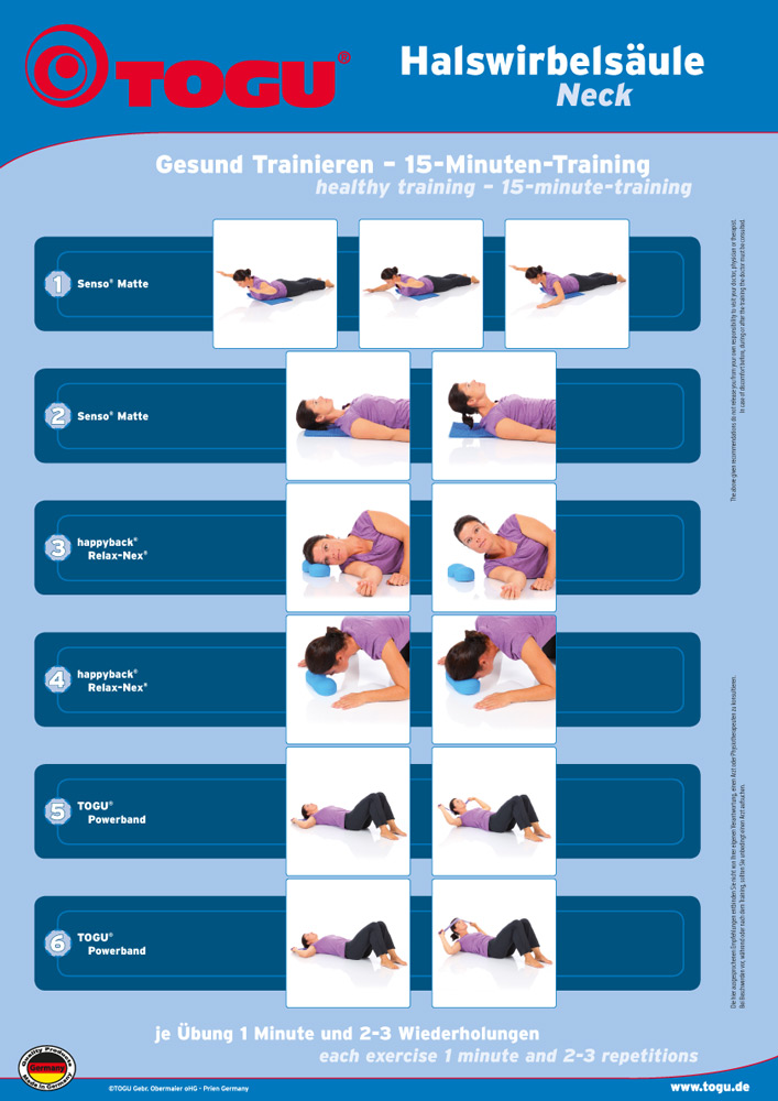 The 15-minute program developed by the team doctor of the German national snowboarding team Dr. Sommer, which you can download here free of charge online and easily integrate into your everyday life, contains such exercises. It can also be carried out by untrained persons. By using the matching cervical spine equipment set, the training stimuli are even more intensive. Other articles you will find in this category are also suitable for use in this area.