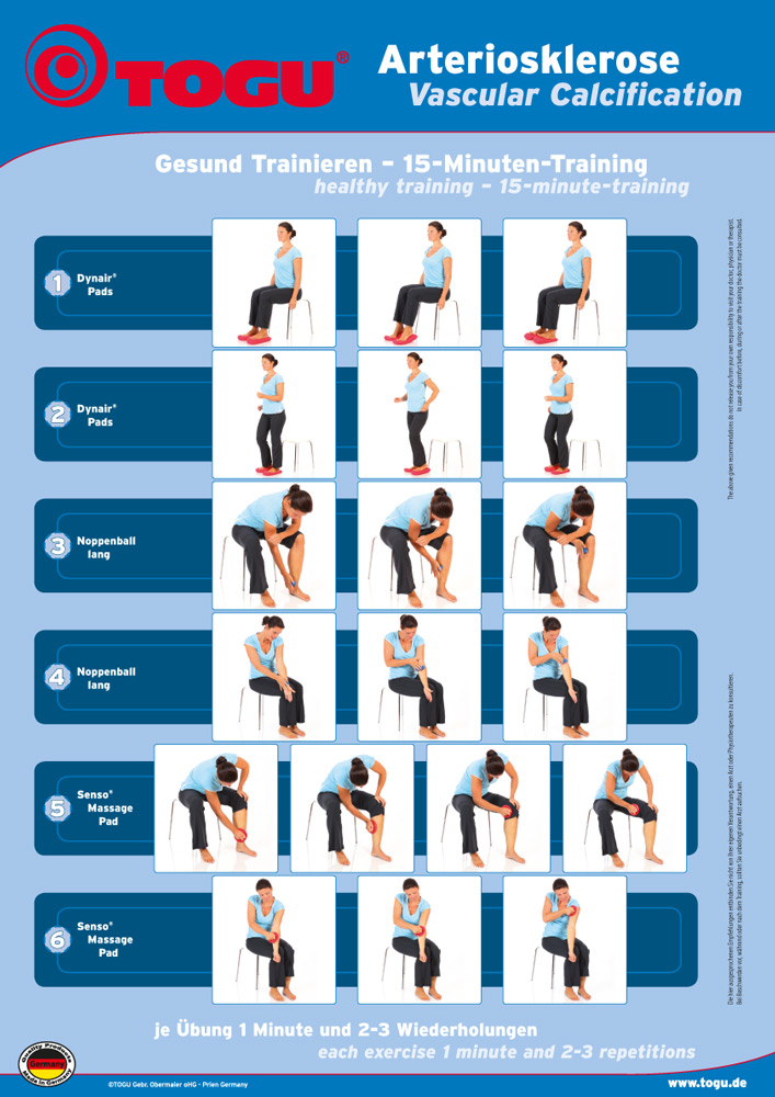 Das 15-minütige Bewegungsprogramm zu dieser Indikation beinhaltet passende Übungen, die in Absprache mit Ihrem Arzt ausgeführt werden können. Es ist für Sie hier kostenlos online abrufbar und einfach in Ihren Alltag einzubauen. Das Programm ist auch für Untrainierte geeignet. Das spezielle Arteriosklerose-Set motiviert zusätzlich zum Training und zur Bewegung. Ideal sind die luftgefüllten Trainingsgeräte auch für die Anwendung in der Gruppe.