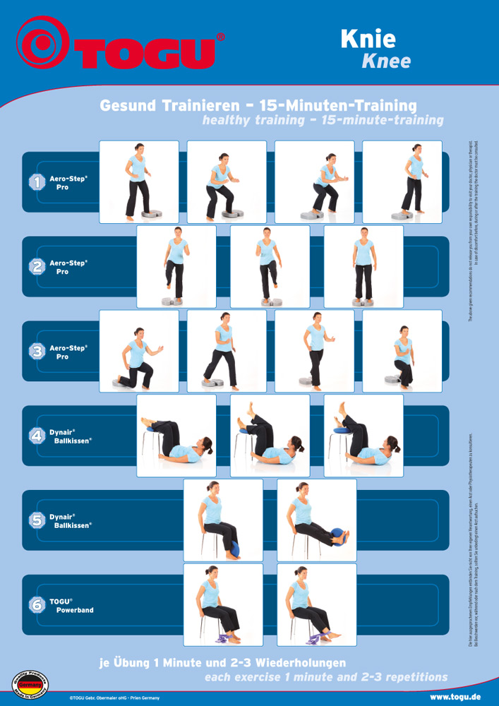 Das vom Teamarzt der deutschen Snowboard-Nationalmannschaft Dr. Sommer entwickelte 15-minütige Knieprogramm, das Sie hier kostenlos online abrufen und einfach in Ihren Alltag einbauen können, beinhaltet solche Übungen. Es ist dabei auch für Untrainierte durchführbar. Durch den Einsatz des darauf abgestimmten TOGU Knie Geräte-Sets werden die Trainingsreize noch intensiviert. Weitere Artikel, die Sie in dieser Kategorie finden, sind ebenso geeignet für die Anwendung in diesem Bereich.