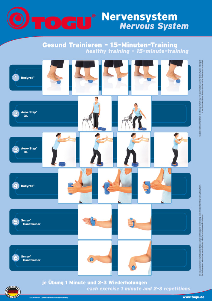 Das 15-minütige Programm, das Sie hier kostenlos online abrufen und einfach in Ihren Alltag einbauen können, beinhaltet solche Übungen. Es ist auch für Untrainierte durchführbar. Weitere Artikel, die Sie in dieser Kategorie finden, sind ebenso geeignet für diesen Bereich. Bei einer bestehenden Störung des Nervensystems kann Ihnen Ihr Arzt individuelle Empfehlungen zu dem hier vorgestellten Programm geben.