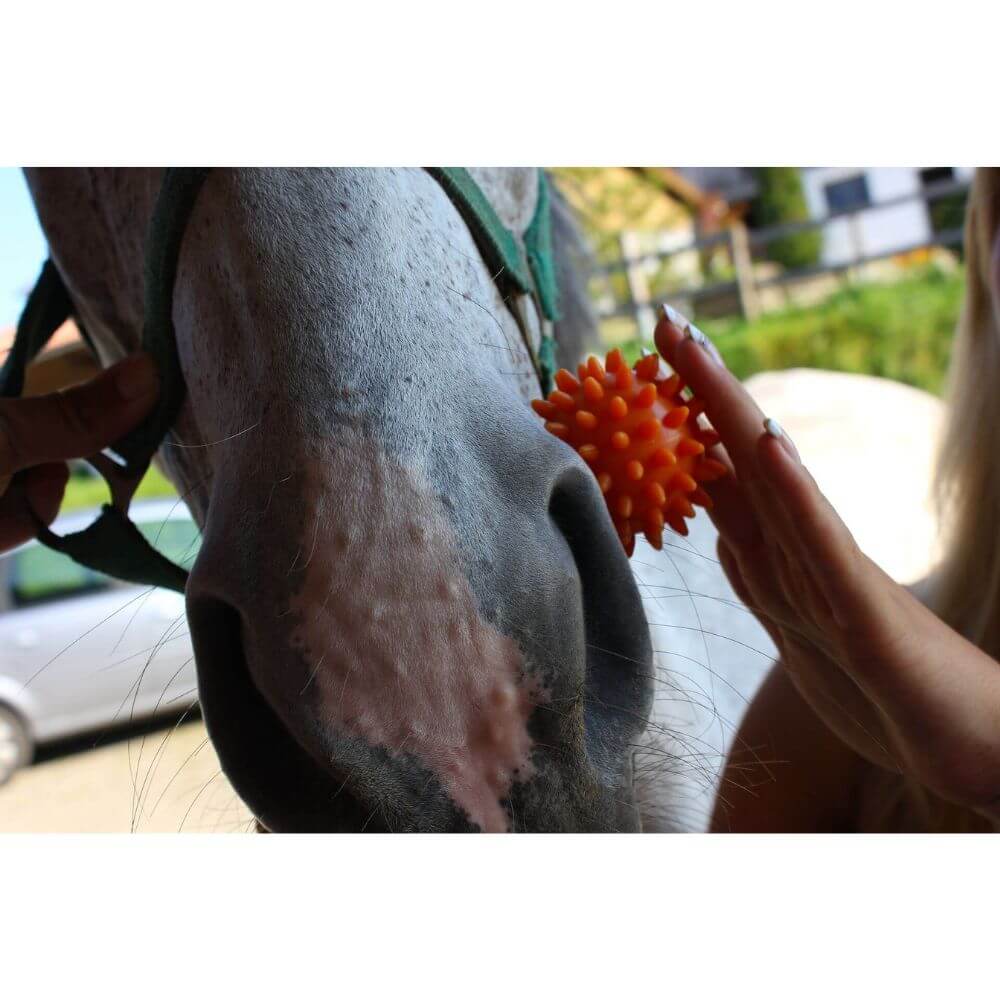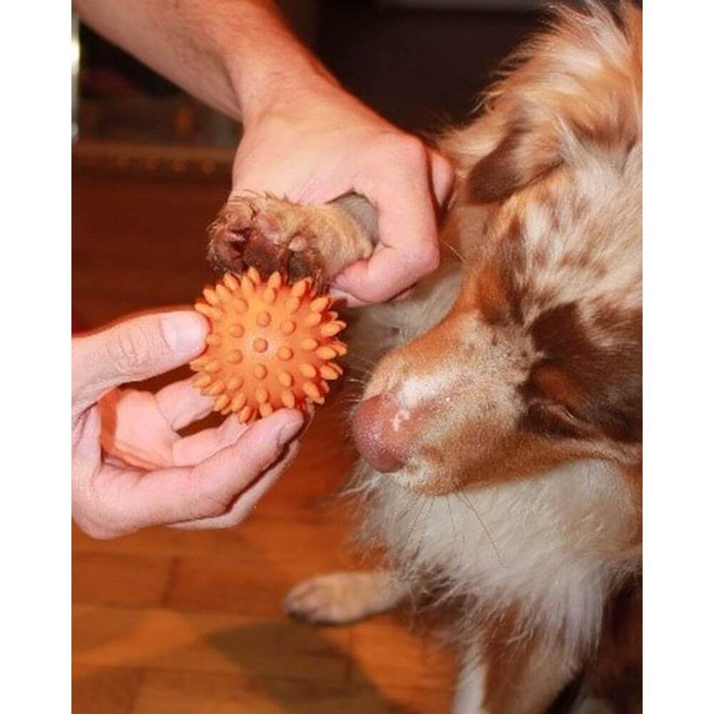 In der Tierphysio wird der Ball zur gezielten Stimulation eingesetzt, etwa zur Förderung der Durchblutung oder zur Lockerung verspannter Muskelpartien.